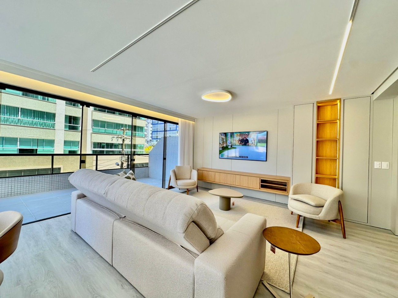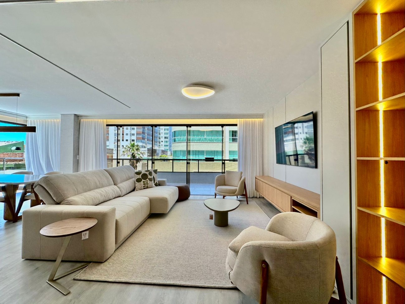 03 dormitórios (1 suíte) Banheiro social?Lavabo?Área de serviço com banheiro de serviço Completamente Mobiliado?Finamente decorado Esquina?Terraço em L?256 m² área privativa Apto 320 m² área total 02 box de garagem Vista para o mar