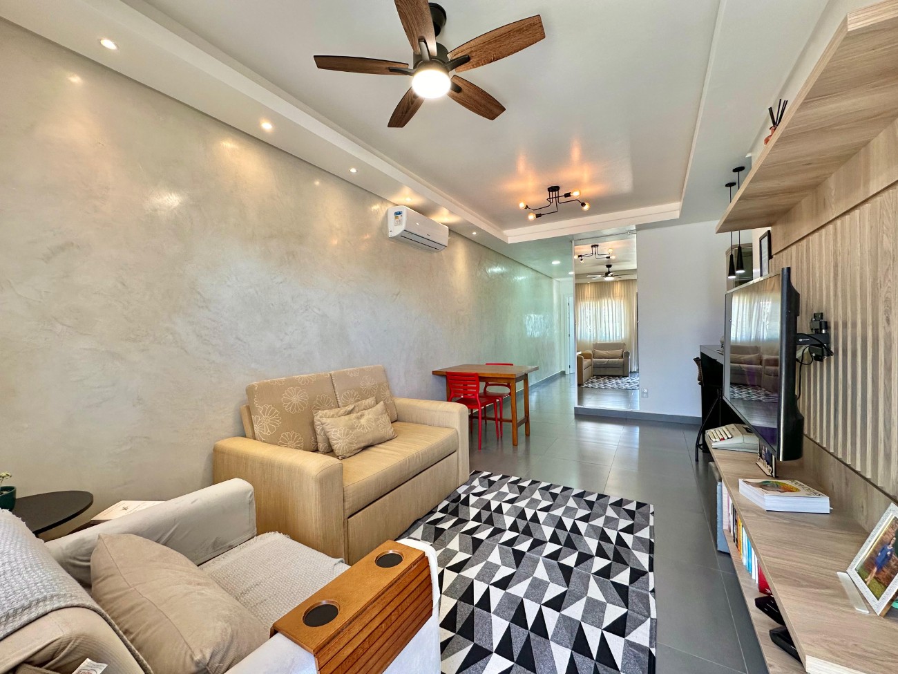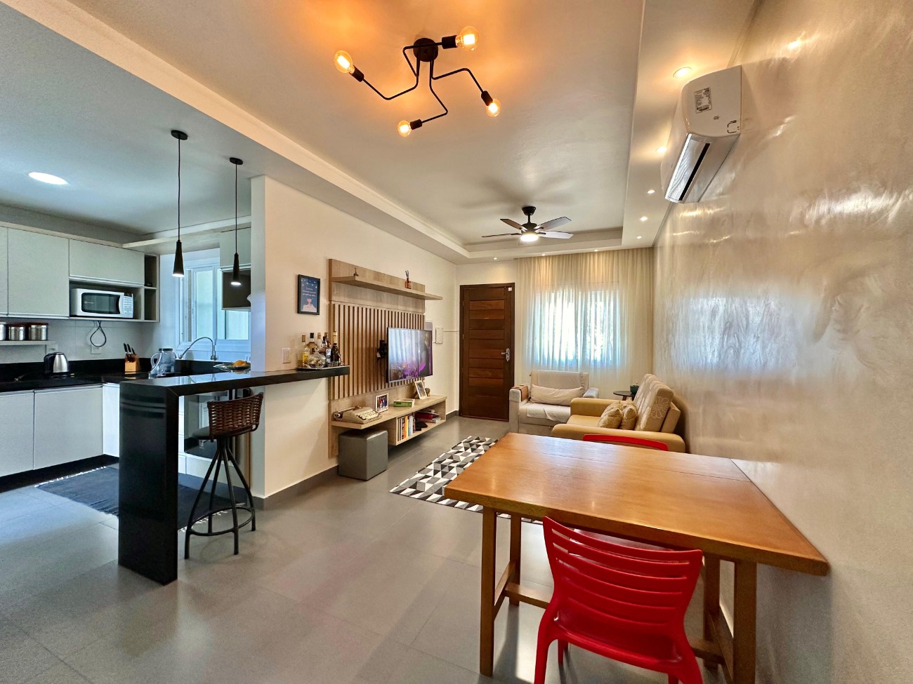 Casa com 77, 83 M² ( + metragem de banheiro, quiosque e piscina que não foi averbada) 02 dormitórios sendo um suíte Banheiro social Living 02 ambientes Espaço Gourmet com churrasqueira e banheiro auxiliar + depósito Piscina Split instalado no living e na suite Semi-Mobiliada Móveis Planejados