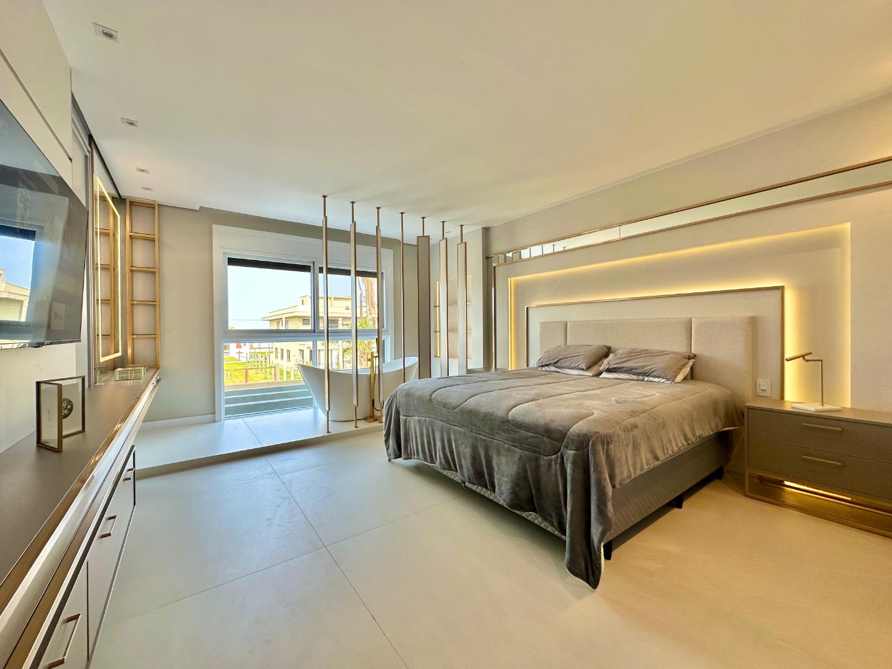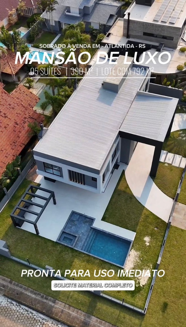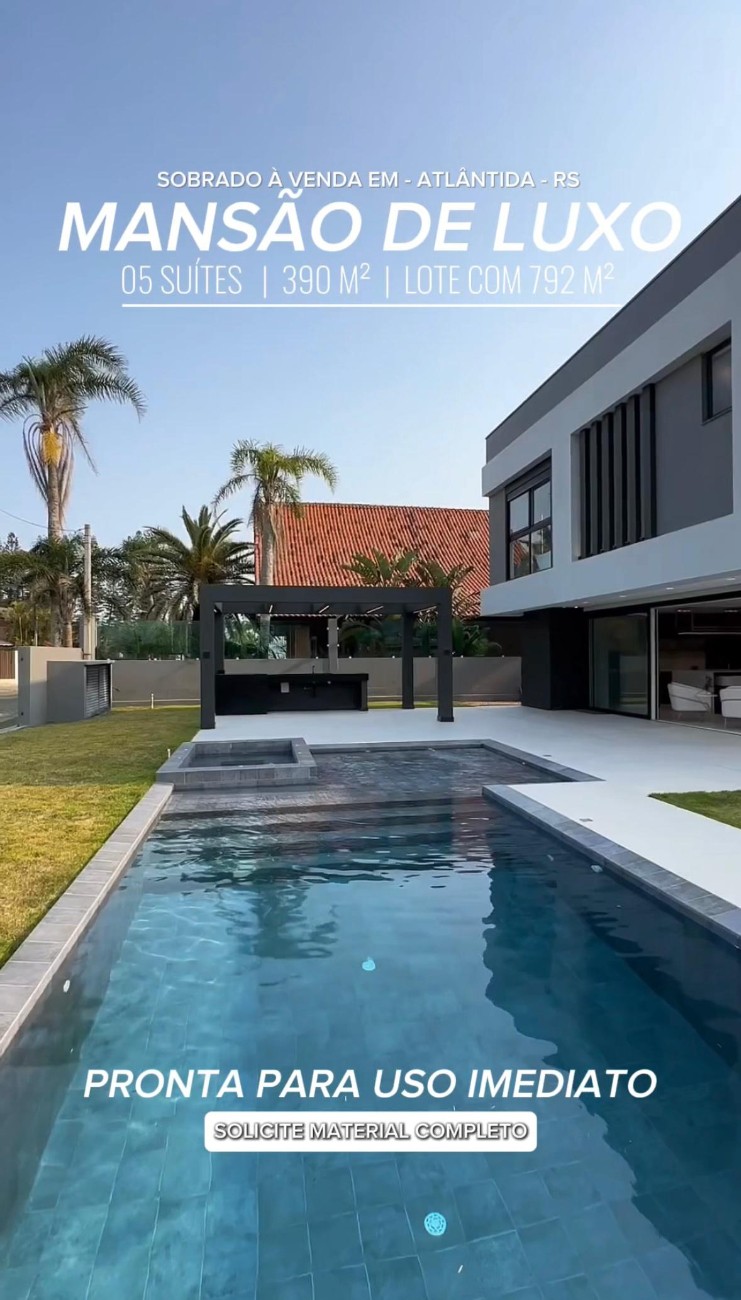 SOBRADO LUXUOSO À VENDA EM ATLÂNTIDA ——————————— Confira : ? Arquitetura contemporânea?5 suítes, sendo duas master, ?Banheira de imersão integrada à suíte e banheira de hidromassagem. ?Amplo living com pé direito duplo integrando a sala de estar e jantar. ?Espaço gourmet composto com churrasqueira a carvão e forno de pizza a lenha. ?Lavanderia inclui dependência de empregada. ?Estar íntimo integrando as suítes no segundo pavimento. ?Aberturas em PVC, com telas de mosquito, automatizadas nas suítes. ?Área externa com pergolado e churrasqueira. ?Piscina de concreto, ofurô e praia infantil. ?Mobiliada e Decorada?Móveis fixos planejados Dalmobile?Móveis soltos GoodsBR e Natuzzi?Terreno: 792 m2?Área privativa 390 M²