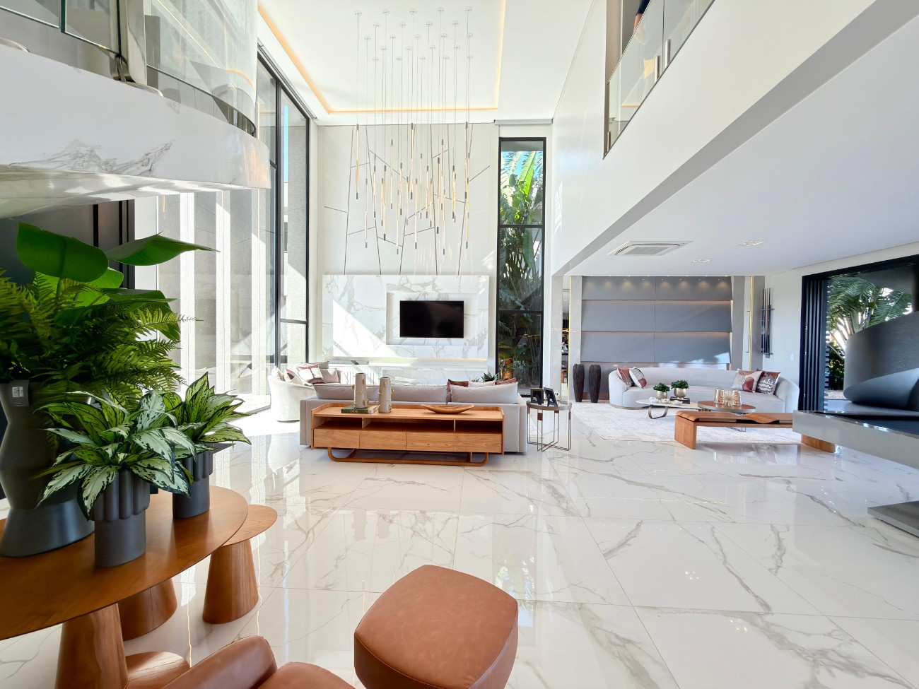 Finamente mobiliada e decorada estilo moderno, ?fachada 90% revestida em pó de mármore italiano espaço de estacionamento aberto para 3 carros; 5 suítes sendo 1 térrea; sala de cinema com projetor; cozinha gourmet e cozinha de serviço; dependência; living com 5 ambientes; automação; piso aquecido nas áreas íntimas; persianas e cortinas elétricas; elevador; pergolado e deck externo suspenso; piscina suspensa na sacada com borda infinita; trapiche.