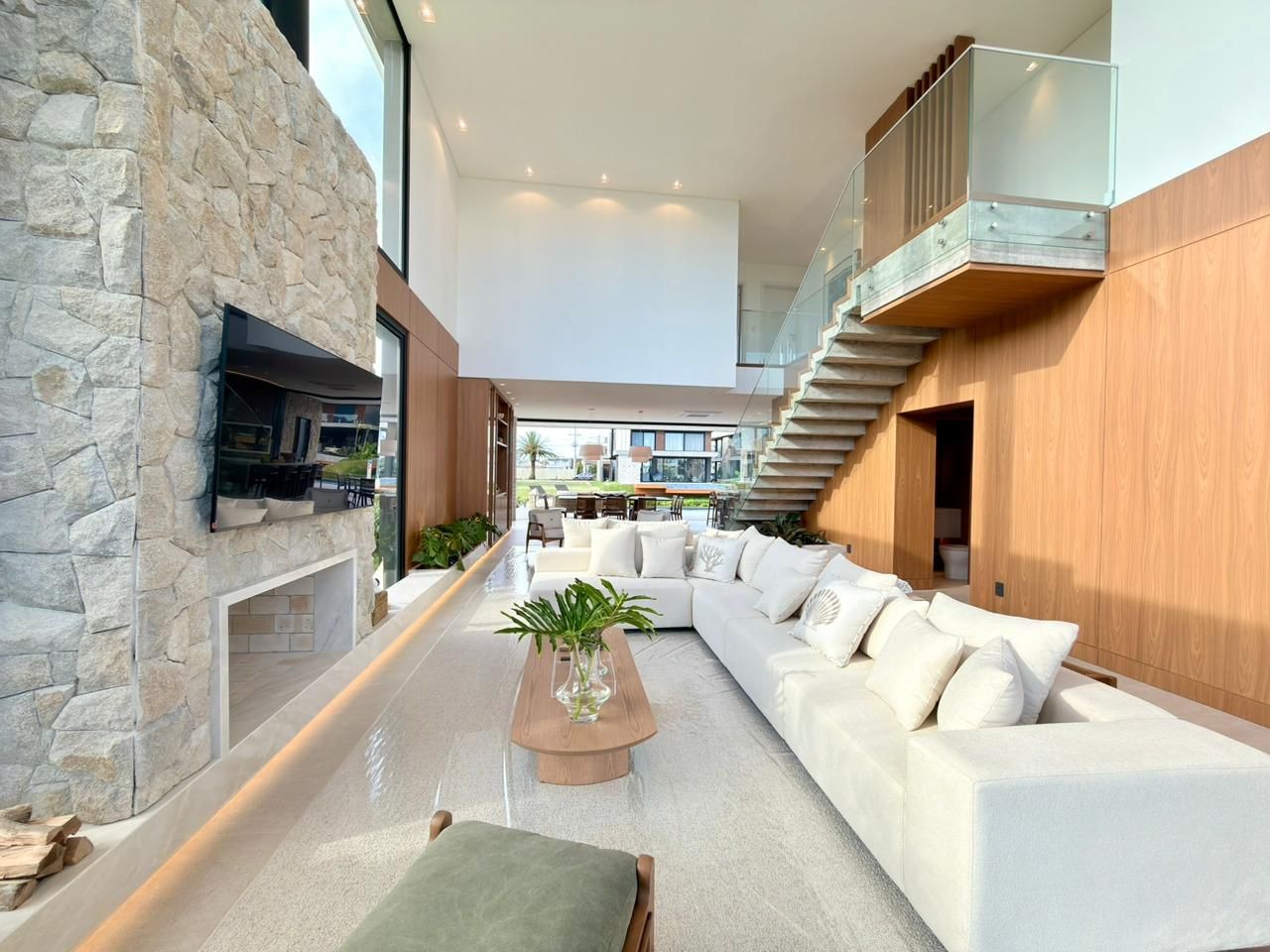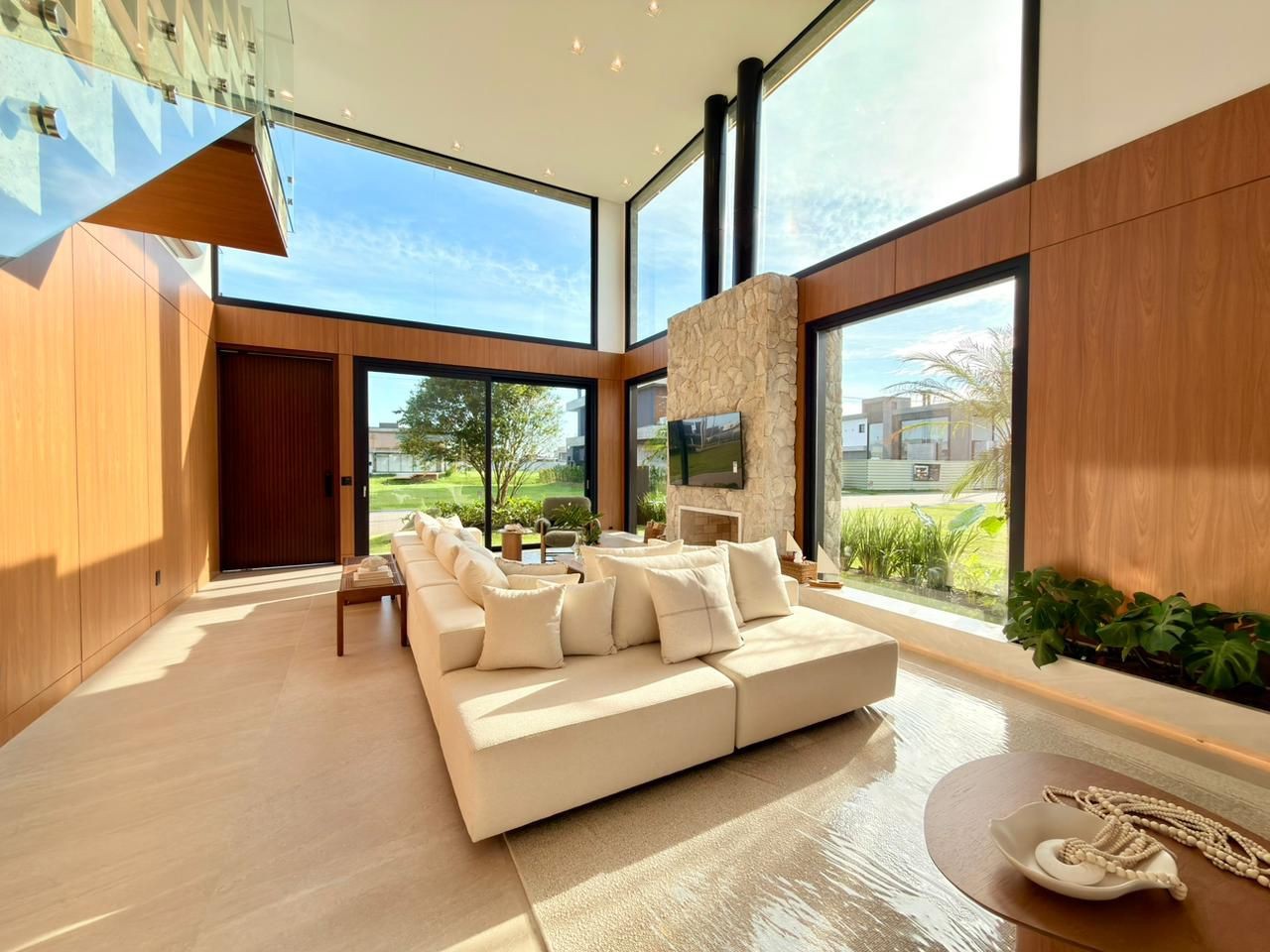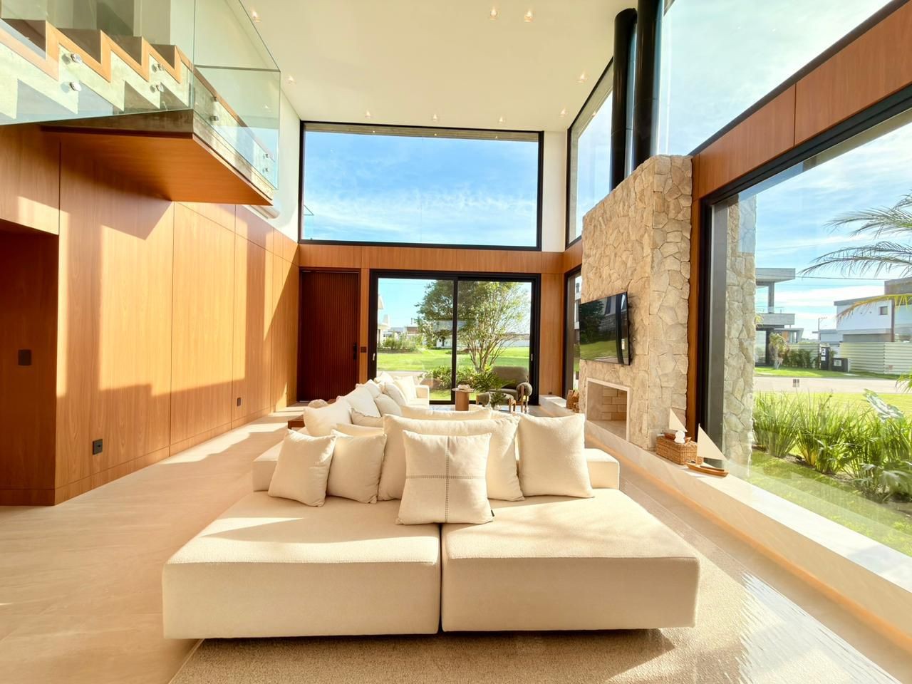 Sobrado com 320 m² Lote Beira Lago +400m² com 15m de testada?05 suítes (1 térrea), todas com A/C?02 Suítes com closet e espera de A/C Suíte Master com banheira Sabbia dentro do box Escada totalmente revestida em madeira natural e guarda corpo com vidro laminado 5+5 Esquadria da varanda com trilho invisível e de embutir na parede Cozinha Gourmet com Churrasqueira com grelha Parilla + Bifefeira Automação de iluminação, A/C e persianas com Alexa?Adega 34 garrafas e cervejeira 82L Cozinha de Serviço completa (Todos eletros e espera para A/C) Ampla lavanderia com uma lava e seca + espera para outra máquina Depósito que também pode ser transformado em dependência de empregada (possui espera de A/C) A/C do jantar modelo Windfree, para maior conforto Casa finamente mobilíada, incluindo móveis externos Piscina de concreto com prainha Deck em garapeira com tecnologia, sem grampos Banheiro da piscina com box/ducha interno Jardim completo e de muito bem executado, bem iluminado, com irritação e poço artesiano.