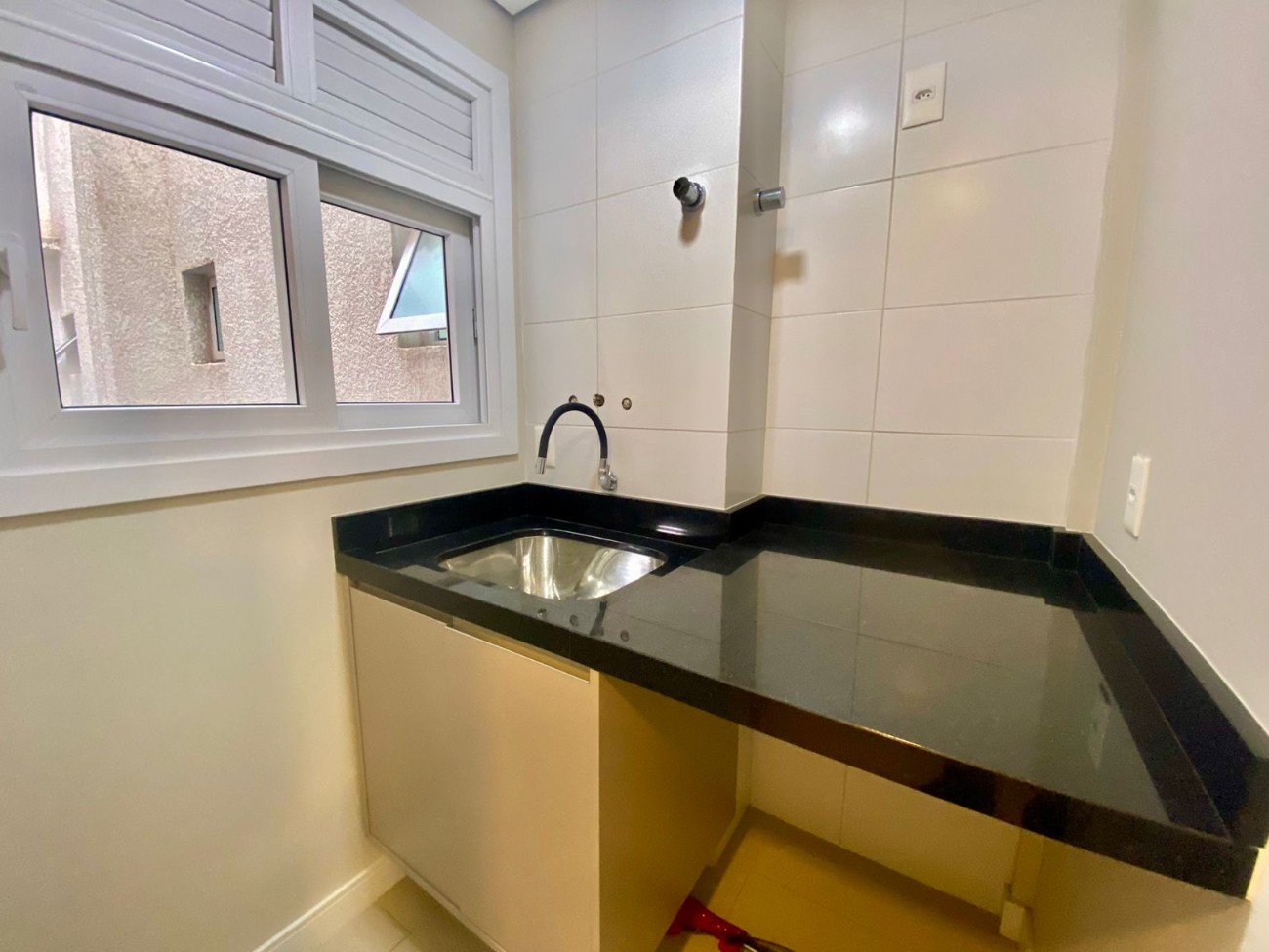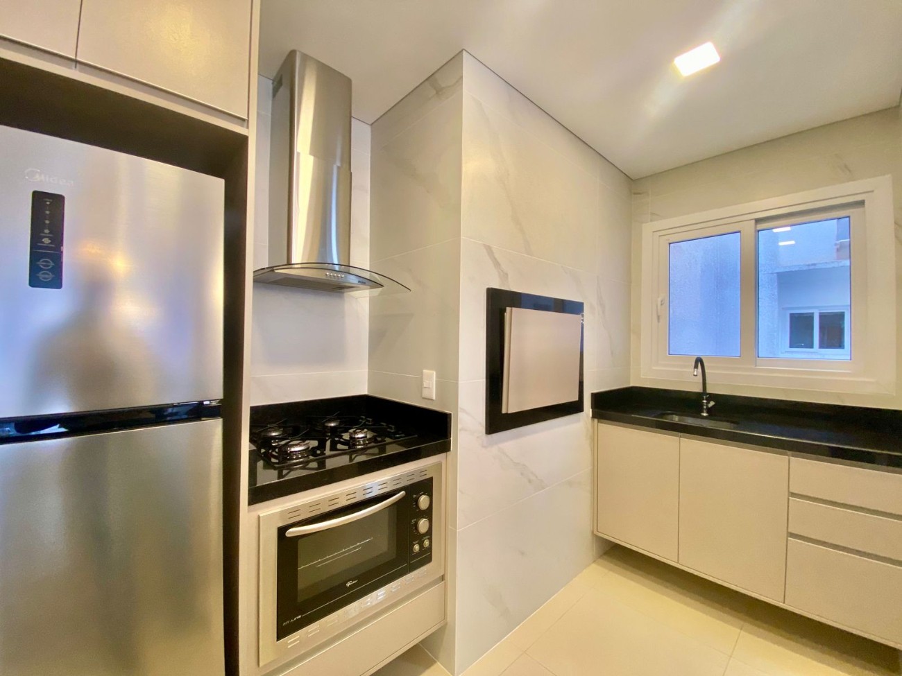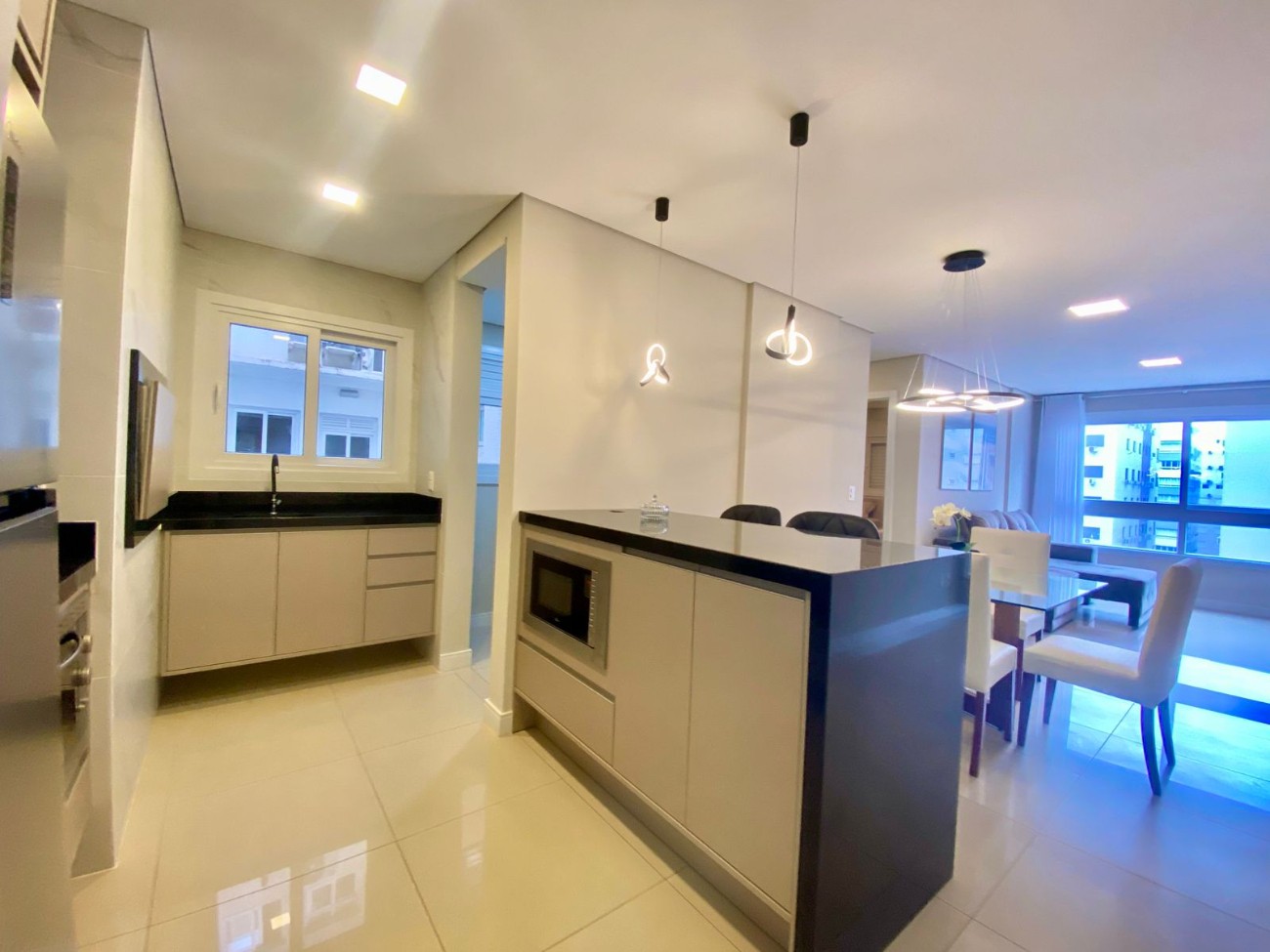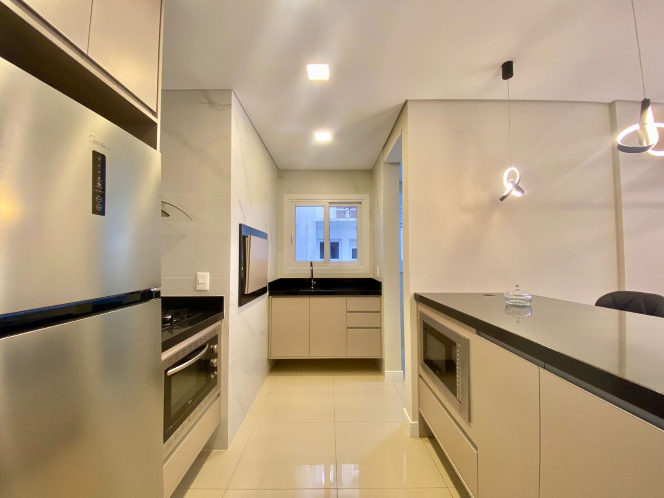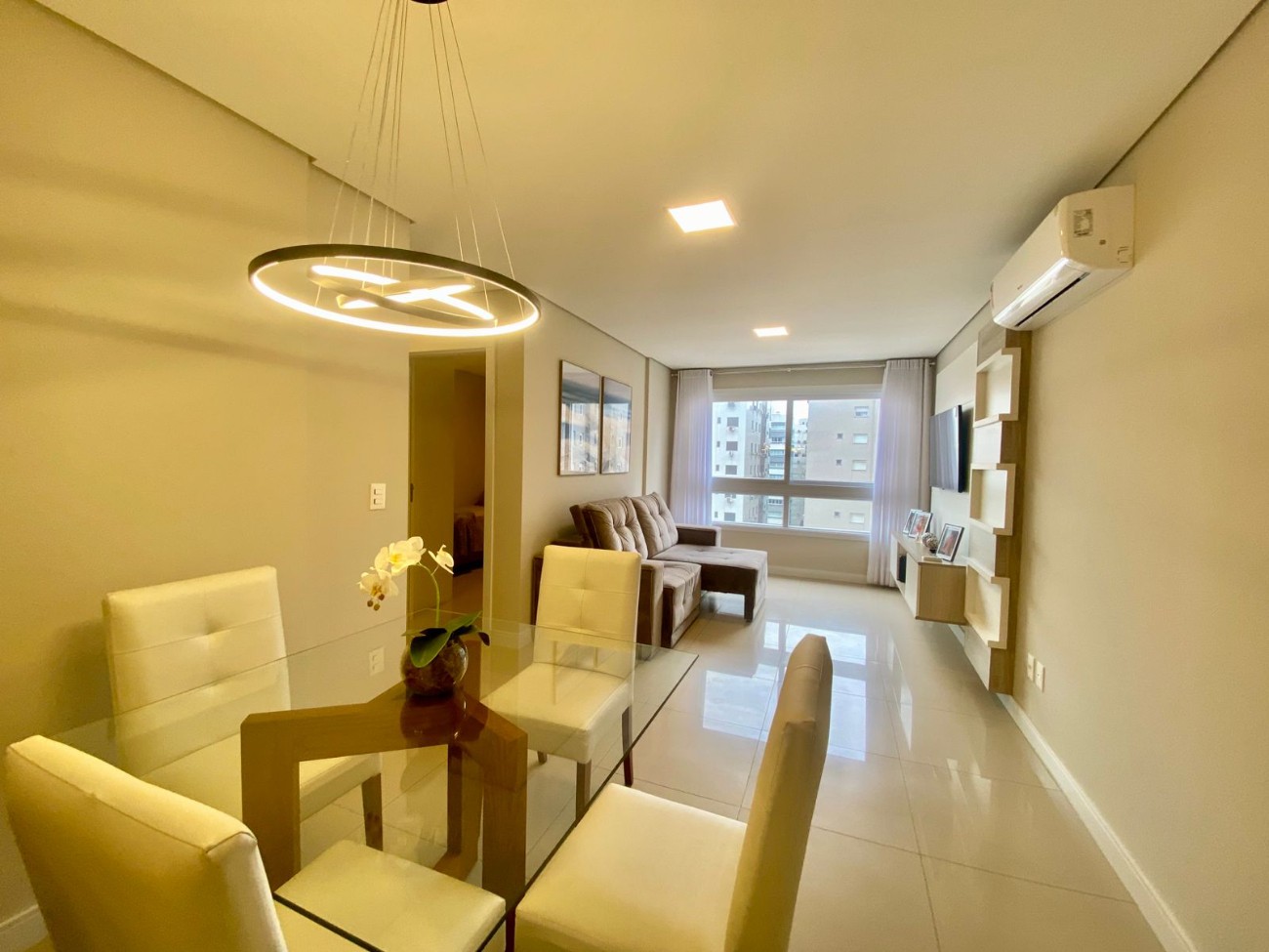 Apartamento moderno de 2 dormitórios com 1 box de garagem, ideal para quem busca conforto e praticidade no dia a dia. Conta com ambientes integrados, cozinha planejada com acabamento sofisticado, bancada em granito e iluminação pendente de design contemporâneo. A sala é ampla, com ar-condicionado, sofá confortável e painel para TV, perfeita para momentos em família. A área de jantar é bem iluminada, com janelas amplas que proporcionam excelente ventilação natural.