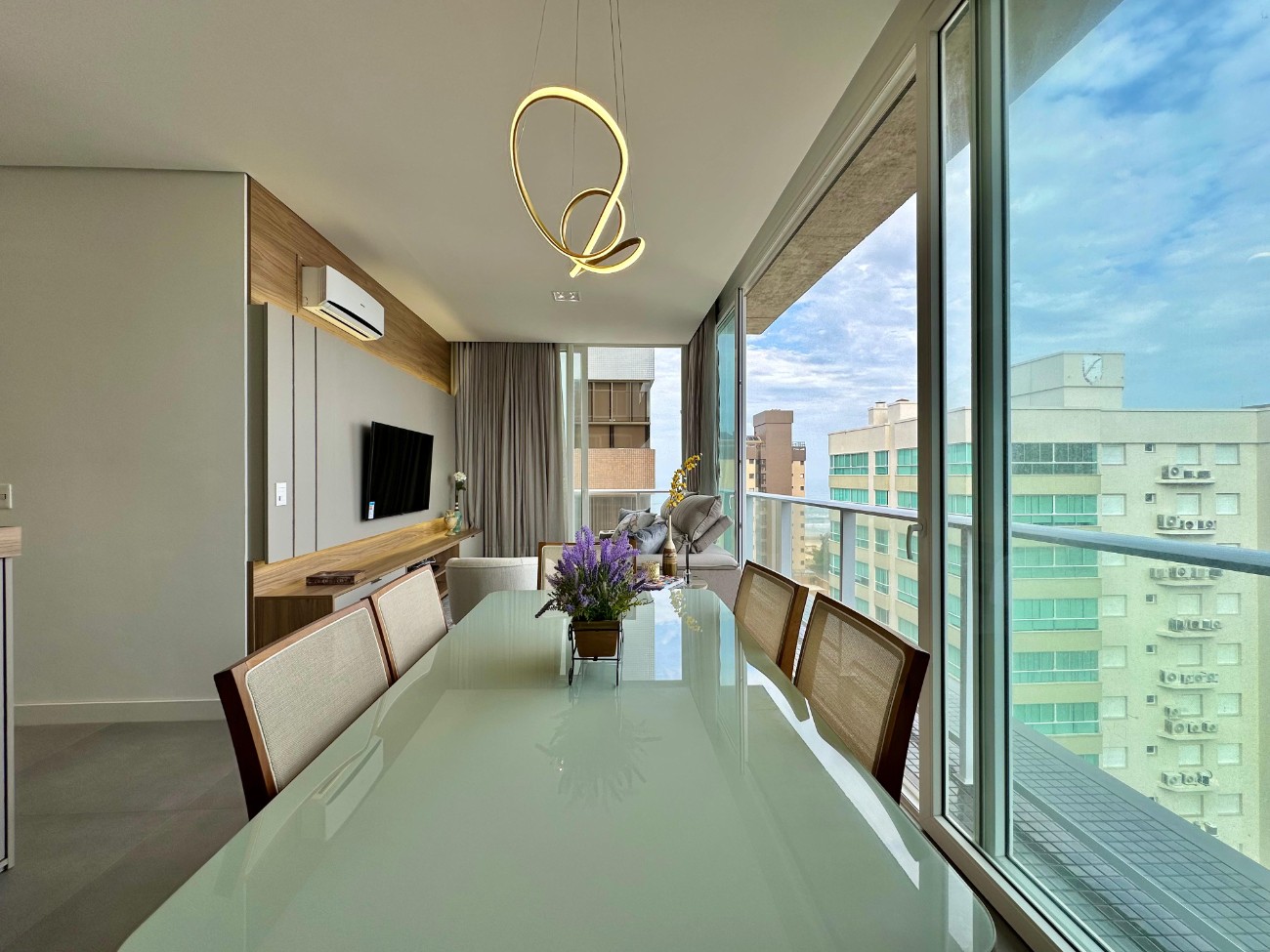 Apartamento de 3 dormitórios, com living integrado em conceito aberto, composto por sala de estar com sacada envidraçada e vista privilegiada, jantar espaçoso e cozinha planejada, além de móveis sob medida, climatização, iluminação sofisticada e acabamentos de alto padrão, proporcionando um ambiente moderno, aconchegante e ideal para quem busca conforto, praticidade e sofisticação no litoral.