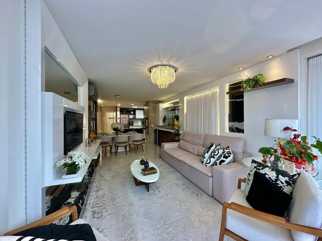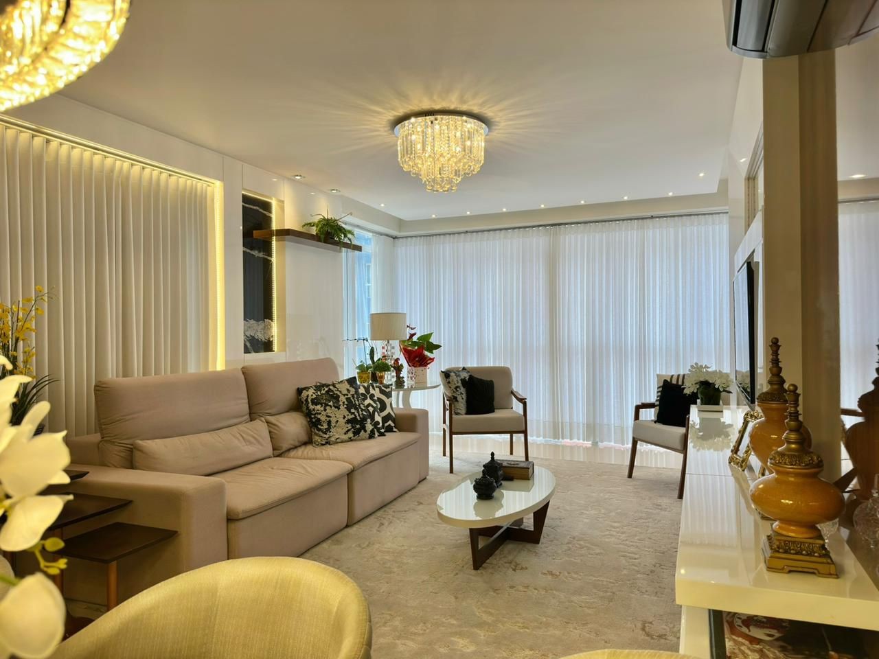 03 dormitórios (Sendo 01 suíte) Banho social Lavabo Gabinete Sacada de frente Vista para o mar Vista para a serra Orientação solar Norte/ Oeste Mobiliado Decorado Altíssimo padrão 129, 00 M² privativos 02 Box Edifício Alto padrão 02 Elevadores Hall decorado Piscina Salão de festas Sala de Jogos Espaço fitness